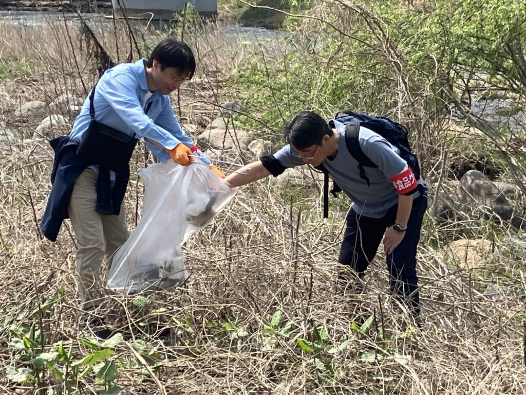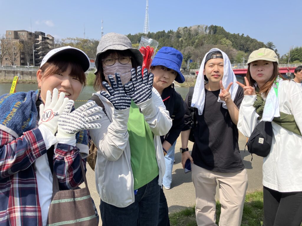 よく晴れた空の下、皆でともに汗をかきながら、オリジナル清掃グッズを身につけて清掃活動を行いました 。