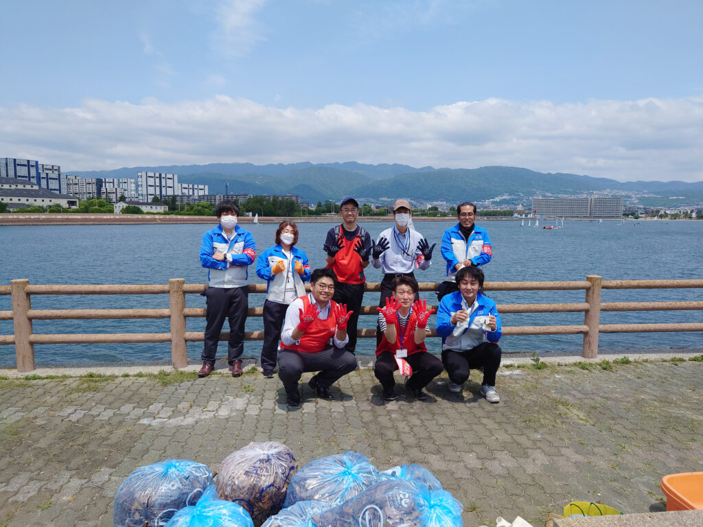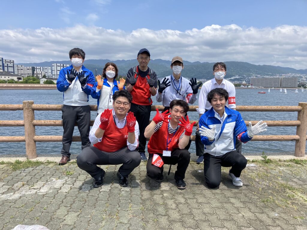 晴天とはいきませんでしたが、海沿いの美しい景色の中、(株)ケー・シー・エス本社から8名、三菱食品関西支社からも1名が参加し、総勢9名がオリジナルグッズを身につけて、西宮総合公園内での清掃活動を行いました。