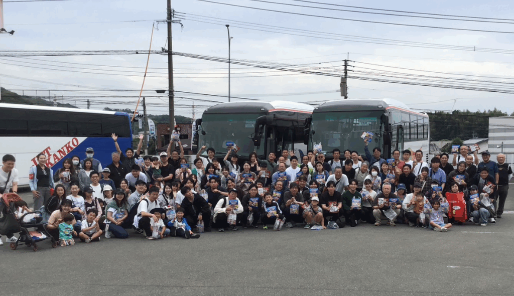 集まった人数は九州エリア勤務社員と家族、合計103名!チャーターバス2台はほぼ満席で、「ラブアース・クリーンアップ2025」の清掃エリアの一つ、「福岡市海の中道青少年海の家北側海岸」に参加した団体の中では一番の大所帯となりました。