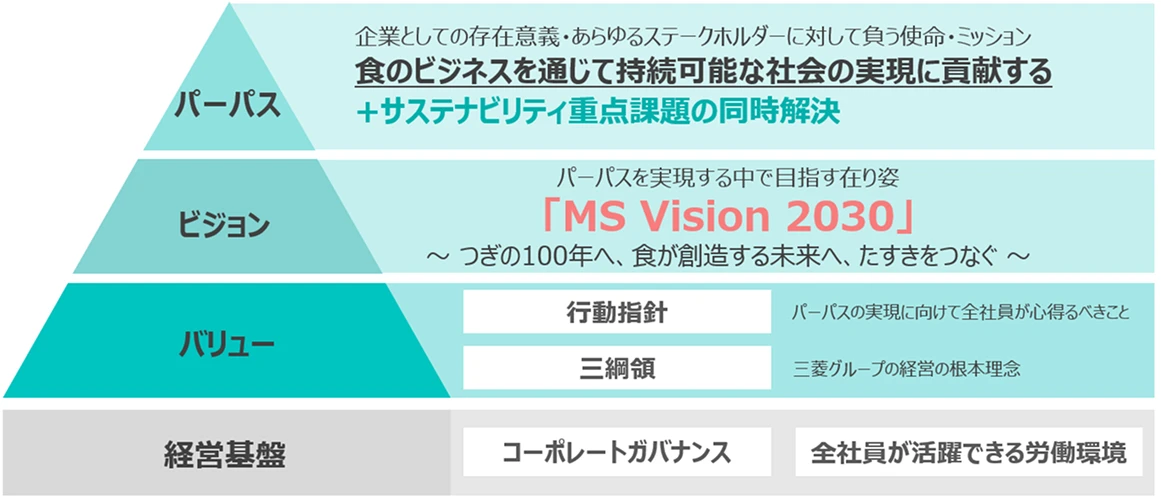 パンデミックの発生や地政学リスクの高まり等、世界的なサプライチェーンの分断による食の供給不安に対し、三菱食品の社会的役割が複雑化していることを踏まえ策定。