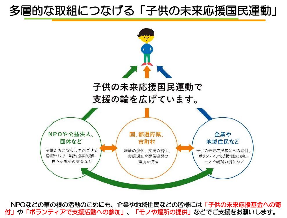 子どもが抱えている貧困の状況は多様で、見えにくいことから、貧困にある家庭や子どもへ、必要な支援を届けるためには、社会全体で取り組む必要があります。政府は、支援したい人や企業と、草の根で子どもたちを支えているNPOなどの団体を結びつけ、国や自治体が行う施策を促進させる「子供の未来応援国民運動」を2015年にスタートさせました。