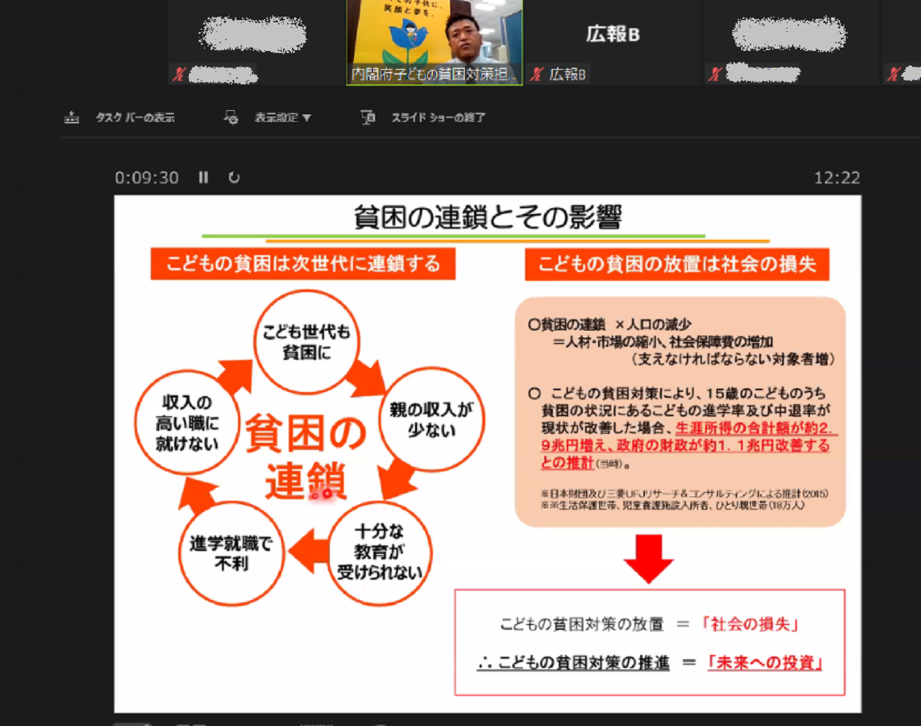 当社はこの取組みに賛同し、2020年より継続的に「子供の未来応援国民運動」への支援を行っていますが、この度、「子供の未来応援国民運動」への理解を深めるべく社内向けセミナーを開催しました。