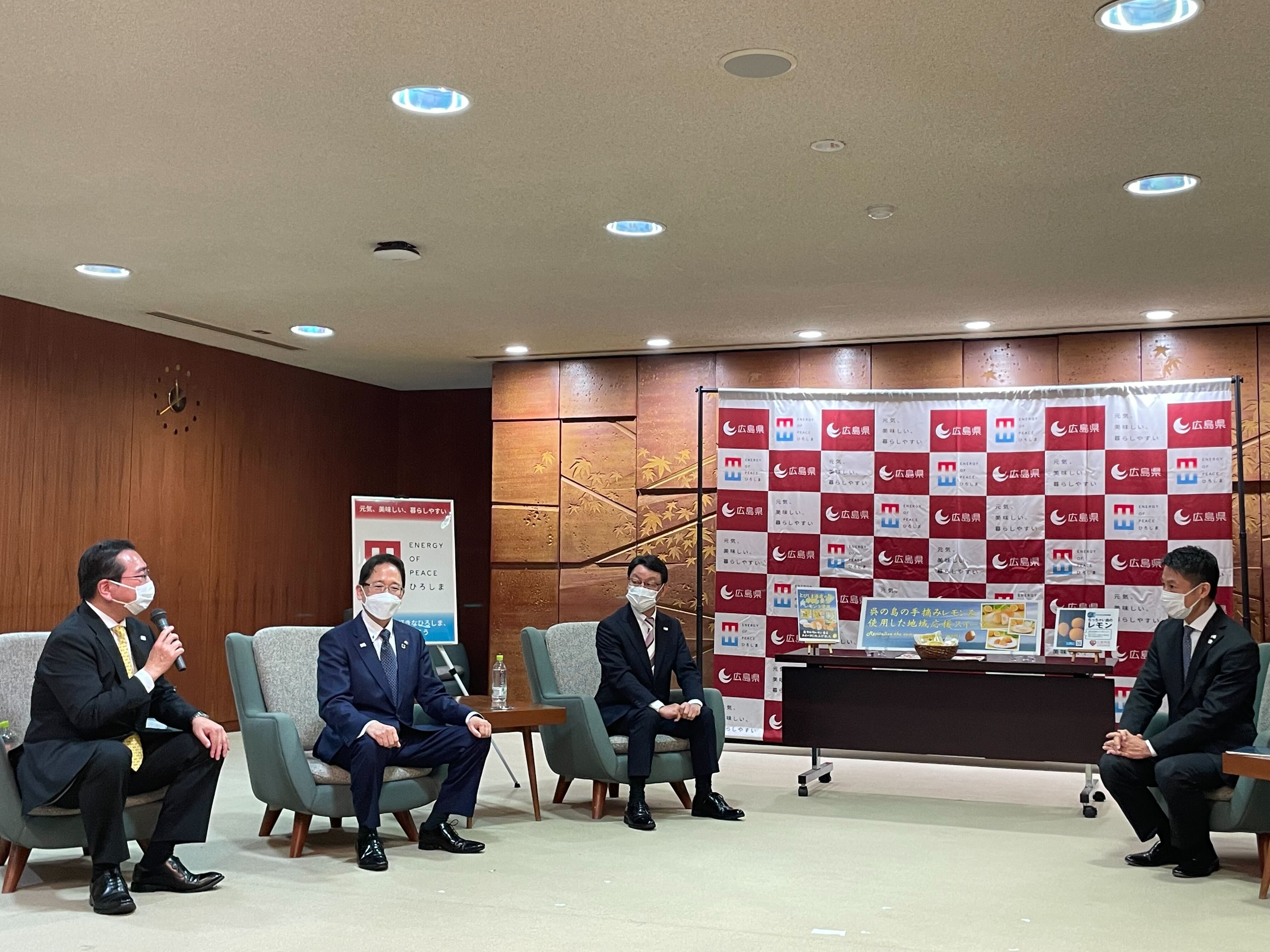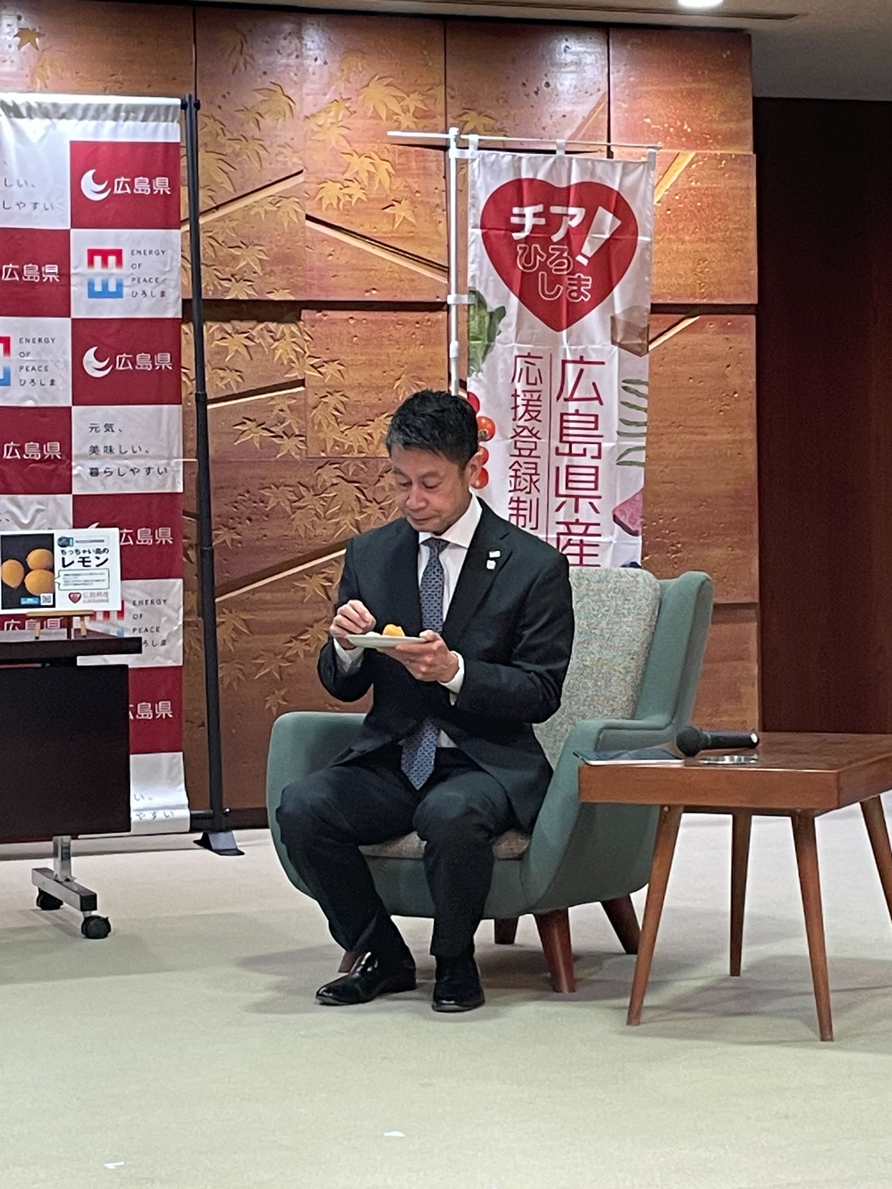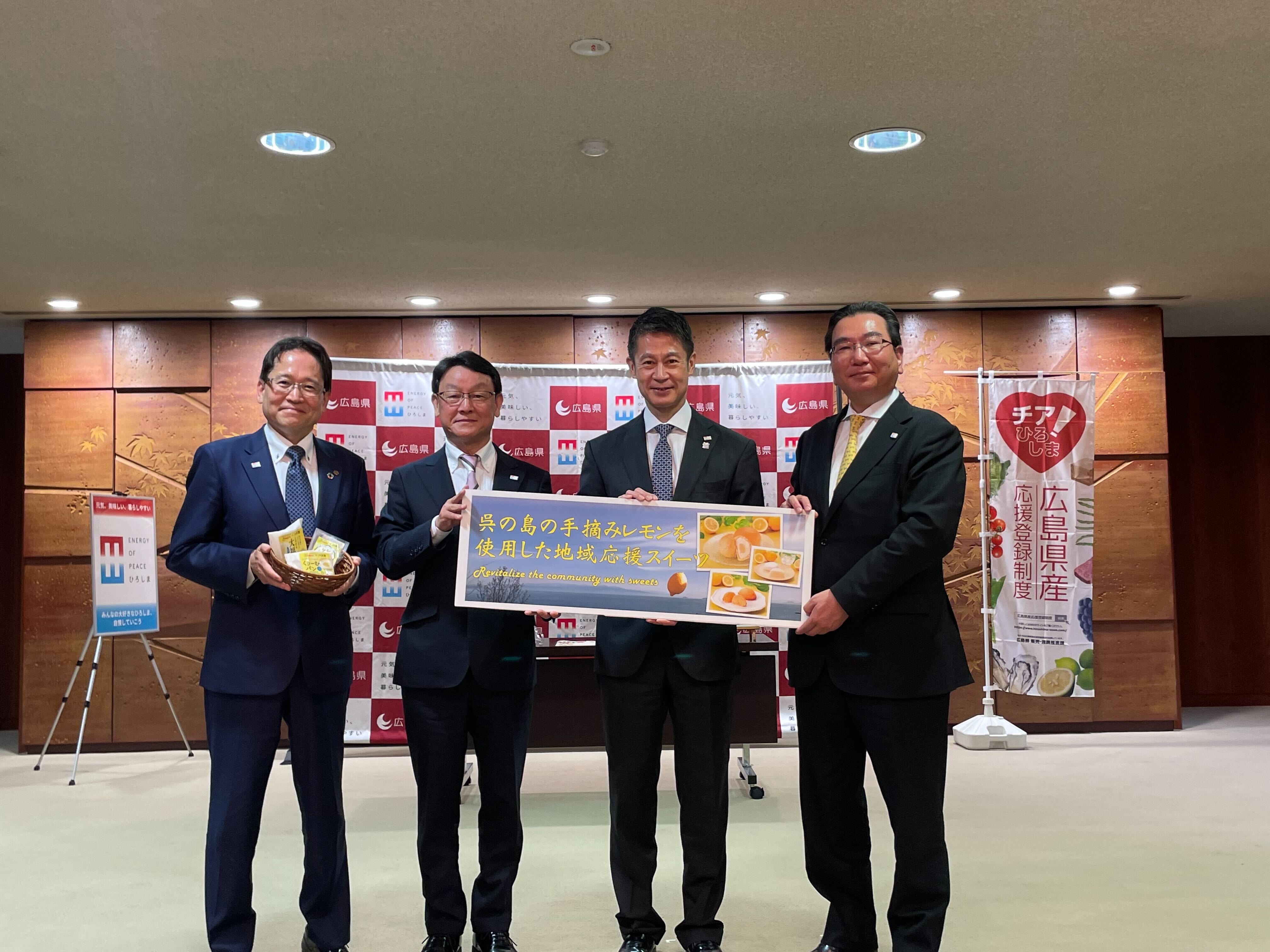 このたび “広島県(狭間農園)”× “フレスタ” × “八天堂” × “三菱食品 中四国支社”の連携プロジェクト第1弾として開発したオリジナルレモンスイーツ3品の成果報告と試食ならびに連携プロジェクト第2弾開発に着手したことを報告するために2023年4月18日(火)に湯﨑広島県知事へ表敬訪問させていただきました。