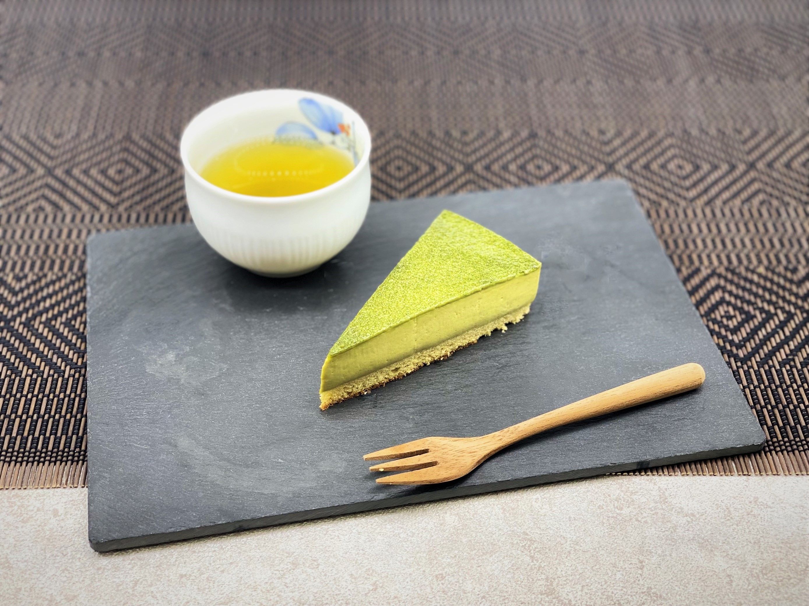 この旨みと香り豊かな「相良村の挽茶」を活かした商品をということで、ケーキの開発がスタートしました。ケーキの種類、層の数などの選定作業に苦労しましたが、創意工夫を重ね、挽茶の良さを最大限活かした4層のチーズケーキ「相良挽茶濃厚ガトーフロマージュ」が完成しました。