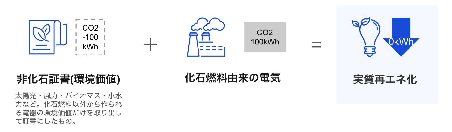 通常、電気そのものには「どの発電方法で作られたか」の区別がありませんが、非化石証書を使うことで「この電気はCO2を出さない方法で作られた」と証明できます。