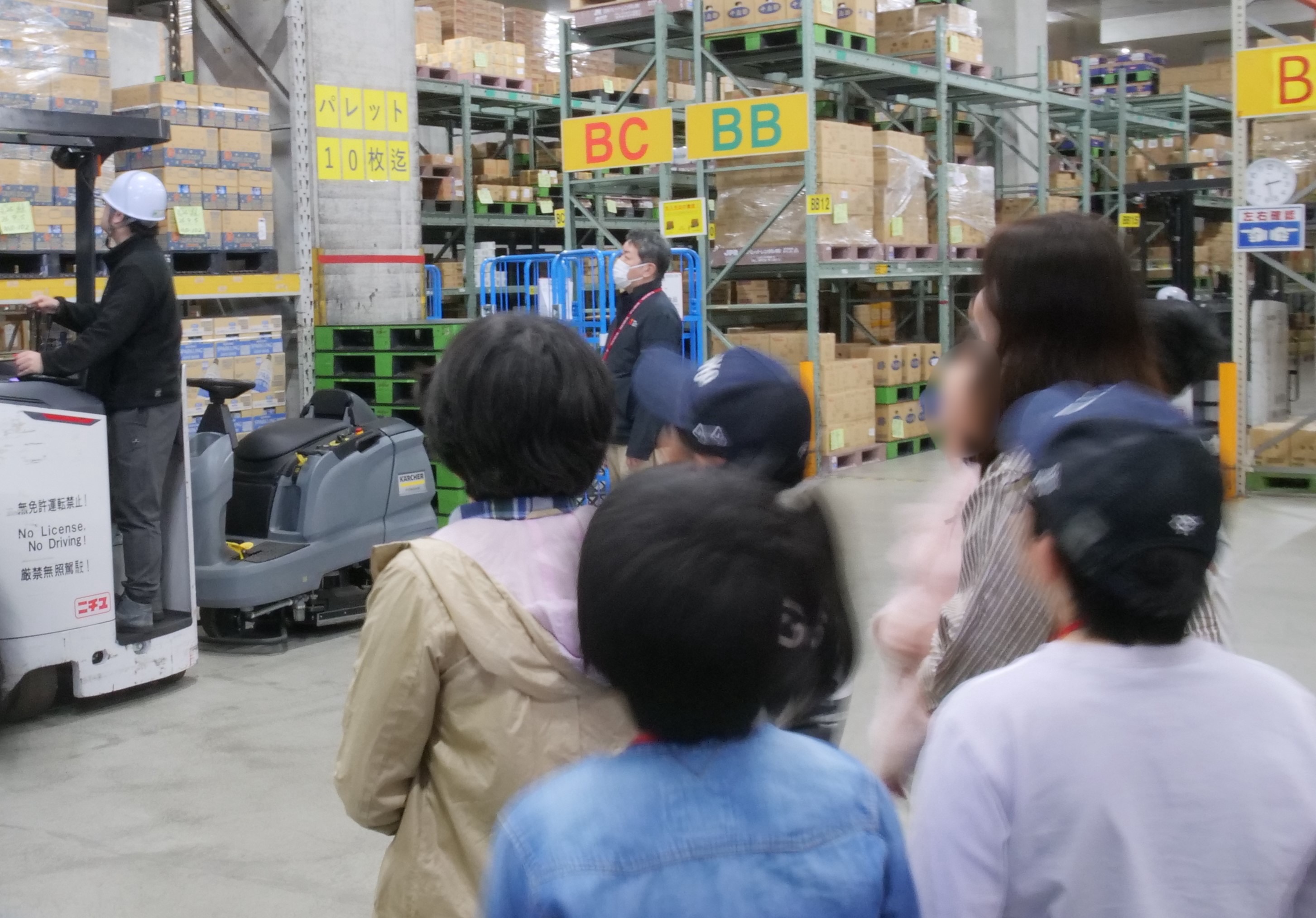 入庫から出庫までの様子を見学しました。実際に物流センター内で使用しているマテハン機器の操作を体験。あわせて、スーパーマーケットなどに並ぶ商品の裏側では、物流部門で多くの人が関わっていることを学びました。