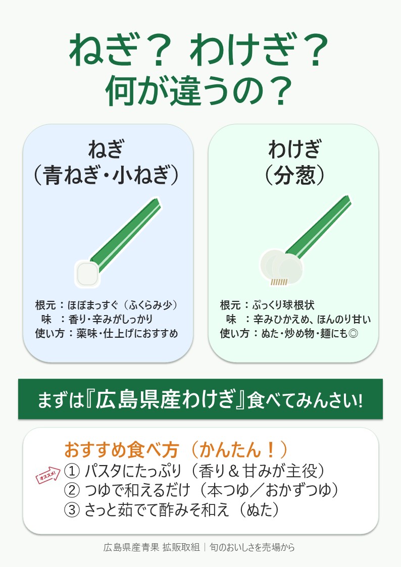 一部の店舗では、POPを活用し、「ねぎ」と「わけぎ」の違いを分かりやすく伝える工夫を行いました。根元の形状や味わい、適した使い方などを比較して紹介することで、これまで分かりにくかった「わけぎ」の特長を視覚的に訴求し、手に取るきっかけづくりにつなげました。